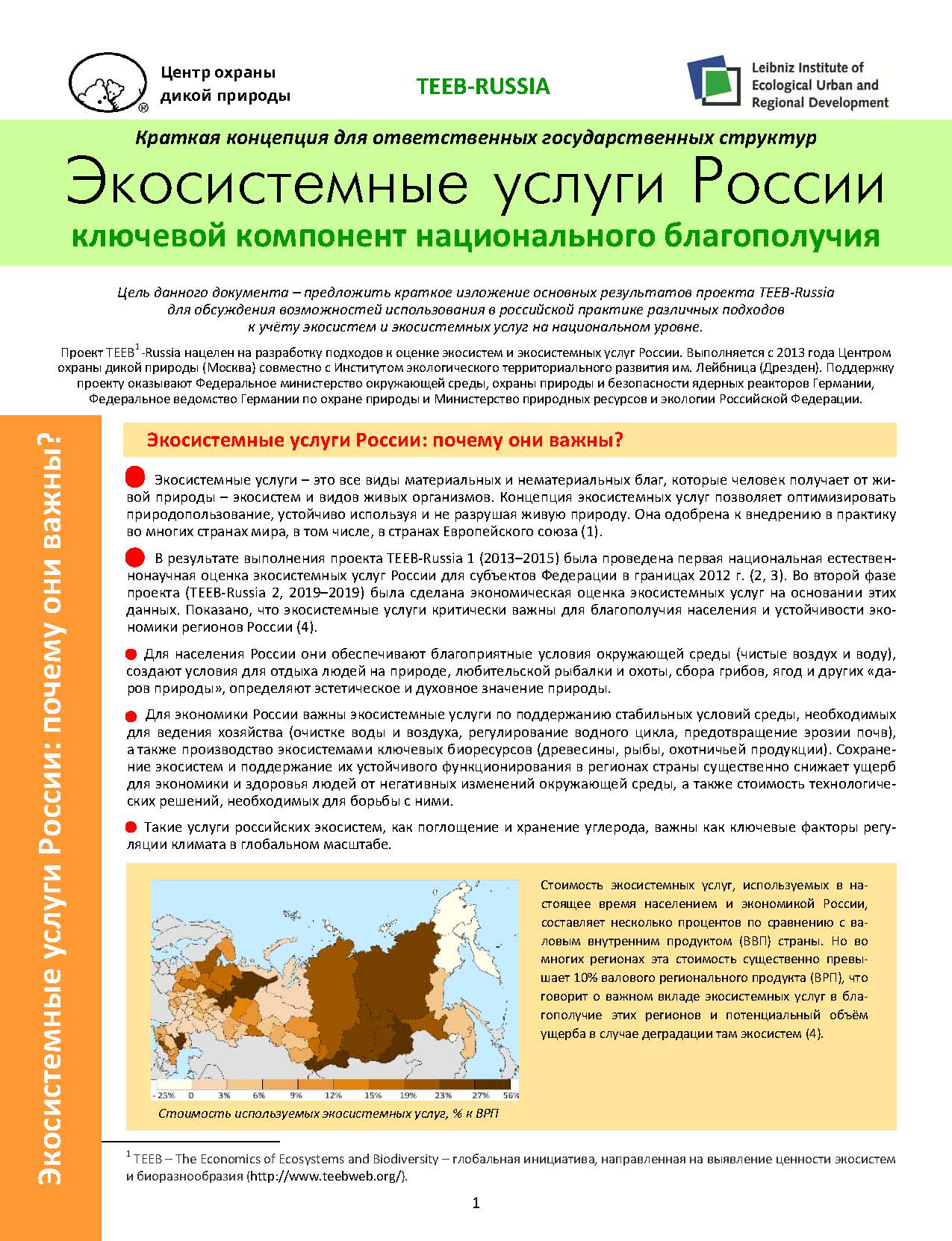 Проект нацелен на разработку методологии оценки экосистемных услуг и биоразнообразия России. Проект выполняется, начиная с 2013 г., в соответствии с решениями 9-го заседания постоянной российско-германской рабочей группы «Охрана природы и биологическое разнообразие» от 23 мая 2012 г., Центром охраны дикой природы совместно с Институтом экологического территориального развития им. Лейбница (Leibniz-Institut für ökologische Raumentwicklung, Дрезден). Поддержку проекту оказывают Федеральное министерство окружающей среды, охраны природы и безопасности ядерных реакторов Германии, Федеральное ведомство Германии по охране природы и Министерство природных ресурсов и экологии Российской Федерации.